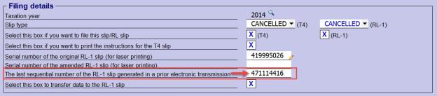 A new line will display so you can enter the last sequential number of the original RL-1 T4 slip generated during a prior electronic transmission performed with the other software program, to allow you to transmit the cancelled RL-1 T4 slip via the Internet.