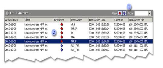 The different columns displayed in the EFILE Archive view allow you to rapidly identify the archived transactions for a given client. |
